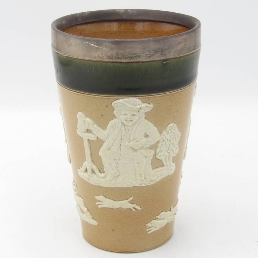 Antique Doulton Lambeth England stoneware tumbler with hallmarked silver rim