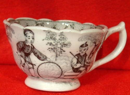 This is spectacular transferware child's tea cup, dating to c1840. The set is transfer printed in black with pearlware glaze on scalloped rims. The pattern is quite scarce. It is commonly referred to as CHINESE CHILDREN'S GAMES (sometimes called Pastimes or Juvenile Games), depicting Chinese children playing games with balls, marbles, bubbles, kites, spinning top, & hoops and sticks. The Chinoiserie influenced motif has an inner and outer border string of flowers and stippling.