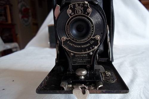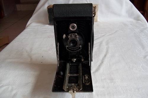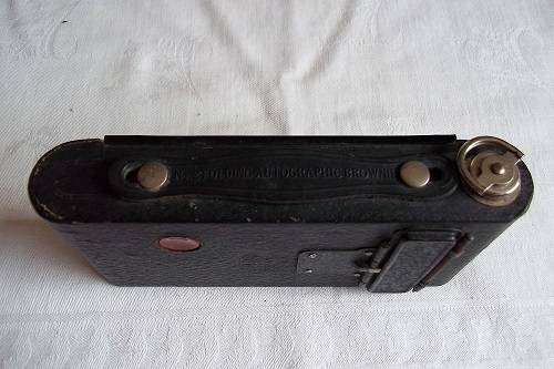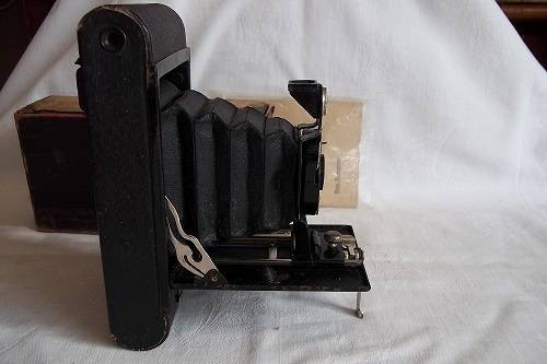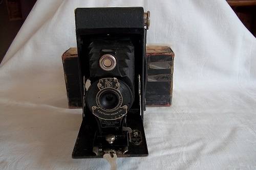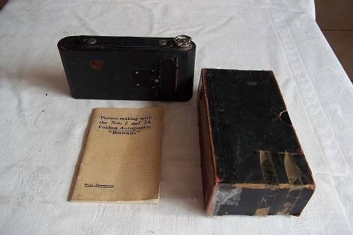 Antique Eastman Kodak No. 2 Folding Autographic Brownie camera. This old camera with the serial number 27253 would have been produced c1915. It is a bellows vertical folder camera with an imitation leather covering. It used 120 roll films. It is in good (untested) condition, and comes in its original box with instruction booklet. great buy for the collector.