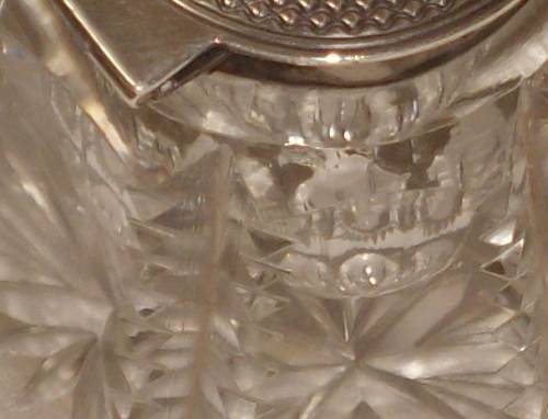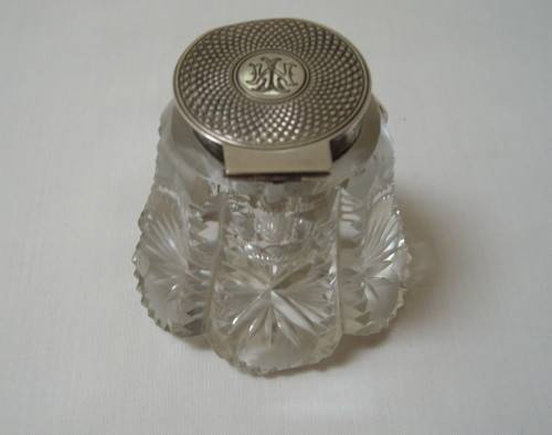 A clear cut-crystal ink well with a hallmarked sterling silver hinged cover and