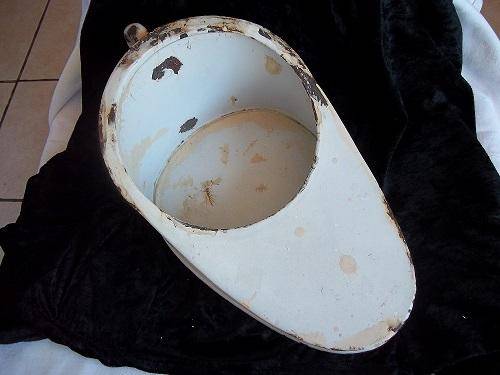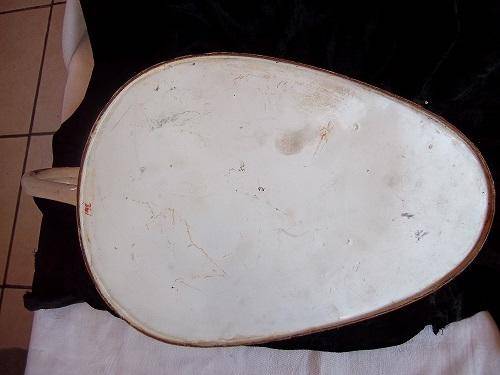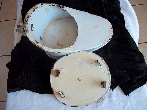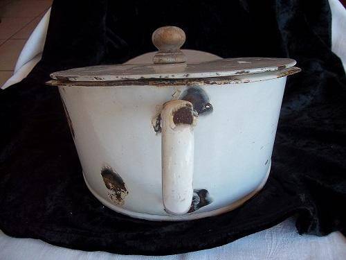 Antique enamel slipper bedpan with lid. This lovely old item 32cm (l) x 24cm (w). The lid has a wooden handle. Due to age, the bedpan does show wear although the wear is all surface wear. A lovely vintage enamel item for the collector.