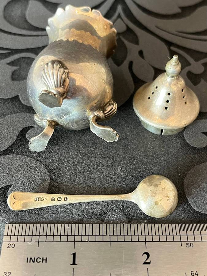 A beautiful antique mustard pot with decorative paw feet and scalloped lid, made from EPNS (electroplated nickel silver). It comes with its original matching sterling silver spoon, fully hallmarked for Birmingham 1909 with makers mark F.H.A.L. (Francis Howard Ltd).
