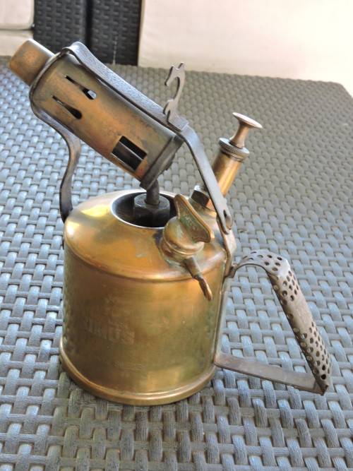 An antique primus-type flame burner / blow torch. The copper cannister is 12cm high and 10cm in diameter. In good condition.