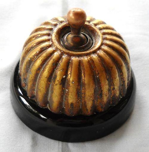 This switch has a Brass Dome and flip switch mounted onto a Porcelain base.