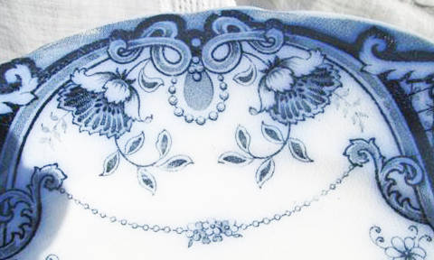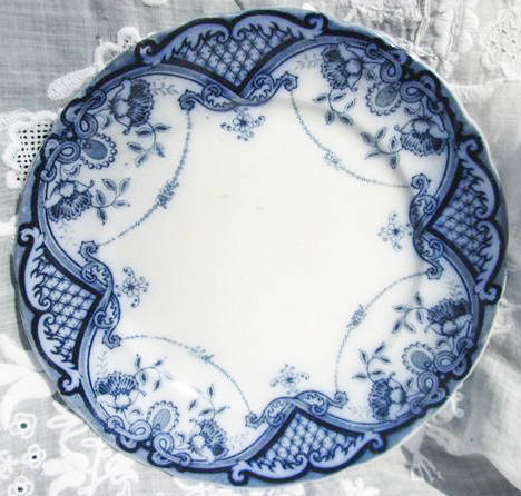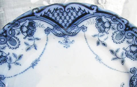 ANTIQUE FORD & SONS BURSLEM FLOW BLUE TRANSFER FINE PORCELAIN DINNER PLATE WITH THE "BUITE " DESIGN, CONDITION ANTIQUE MEDIUM GOOD WITH MINOR FINE CRAZING, STAINING AND A TINY CHIP TO THE RIM AT THE BACK, IT CAN BE FELT MORE THAN SEEN. DIA 21.3cm.
