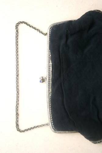 This delicately embroidered antique evening clutch is a real beauty, with a delicate detailed frame and chain. It is lined with ivory satin-like fabric and measures 19x12cm. The fabric is in good condition with minor small holes on the back. The stitching on the back where the fabric meets the frame has come undone, but can be easily repaired.