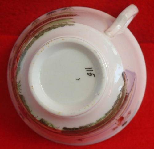 The cup stands 5.5cm high with a diameter of 9.5cm at the rim.The saucer stands 3cm high with a diameter of 14.0 cm. Typical of the day, there is no centre 'well' for the cup to sit in. The number, 115, is found on the base, possibly the number of the painter.