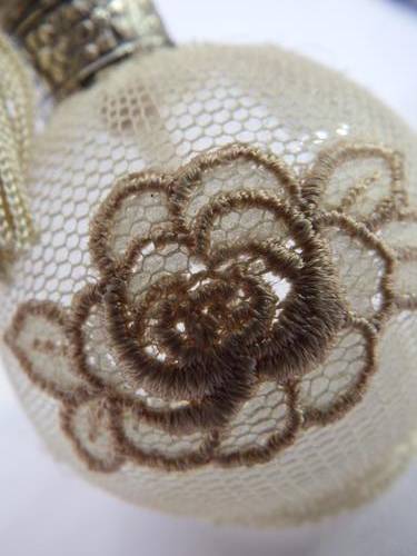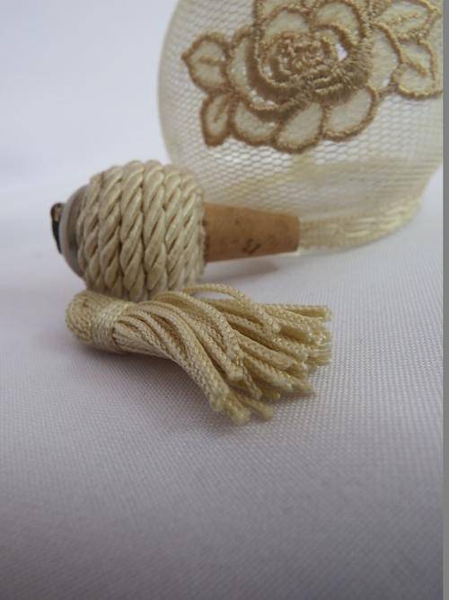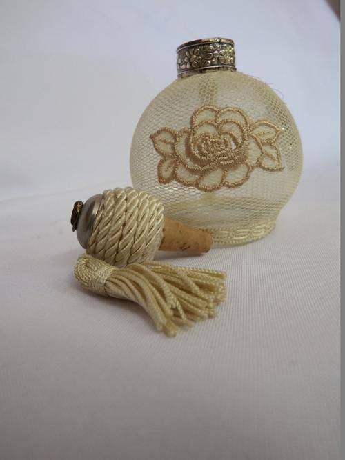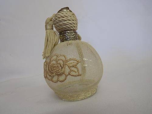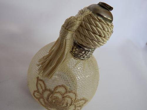 Antique glass perfume bottle with netting cover - as per photo