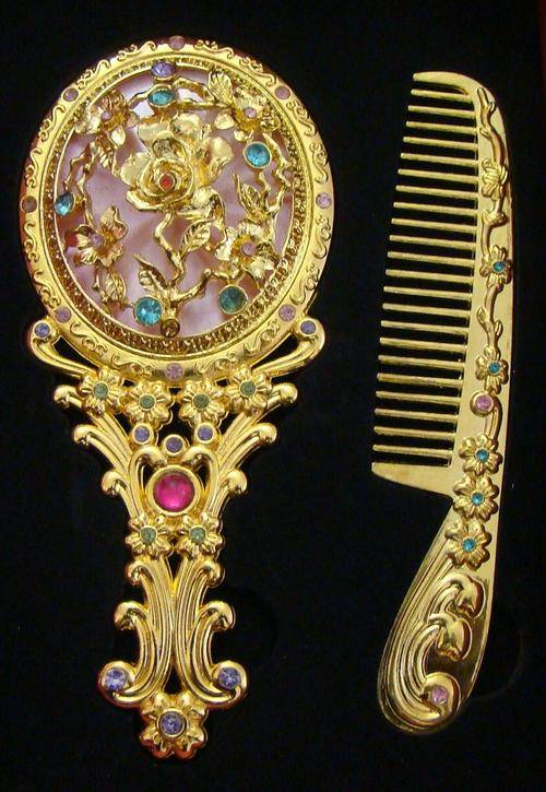 ANTIQUE GOLD MIRROR AND COMB SET WITH SIMULATED GEMSTONES