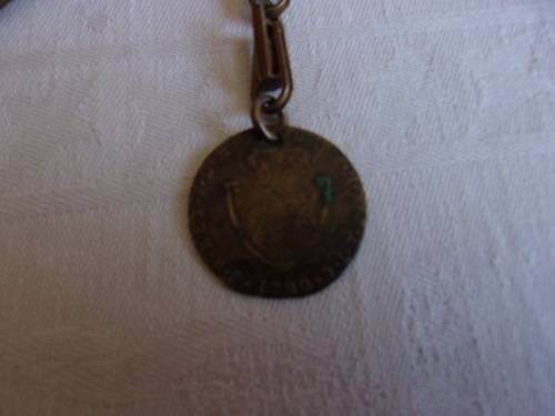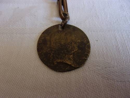Antique gold plated pocket watch fob chain with fob medal and lobster clasp. I would estimate that this old fob chain dates the early 1900s. It has a chain bar at the top, and a lobster clasp on one end and a fob on the other. The medal is a 1790 coin. The chain measures 37cm in total and weighs 23.4g. The fob chain is in good condition. Great buy for the collector.