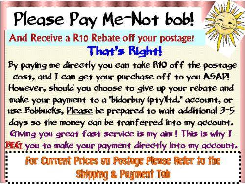 R65.00 Standard shipping applies to orders under R100.00, in most areas in South Africa. R35.00 Standard shipping applies to orders over R100.00. Some areas may attract a surcharge surcharge. This will be calculated at checkout if applicable. Check my rate