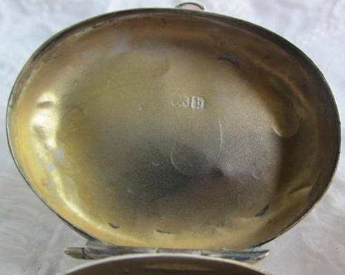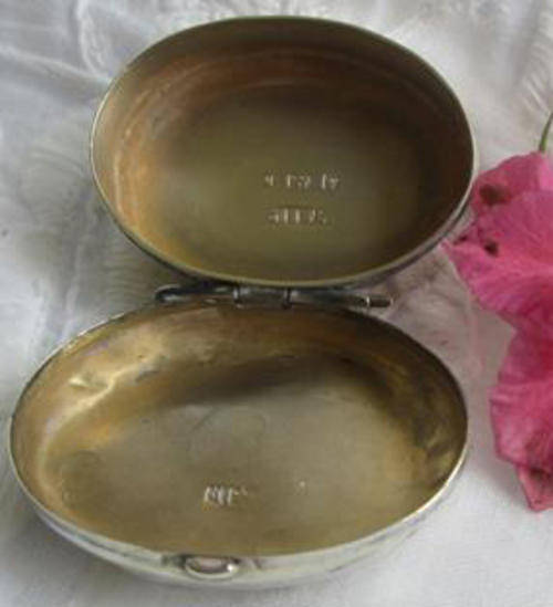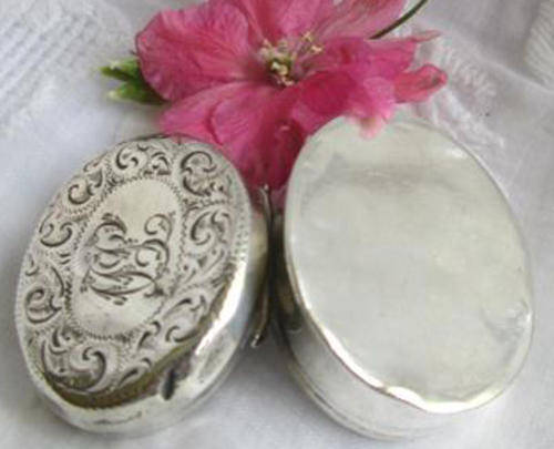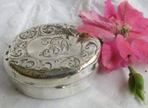 ANTIQUE HALLMARKED, STERLING SILVER PILL BOX, PRODUCED BY ADIE & LOVEKIN LTD, BIRMINGHAM, 1901. THIS PRETTY MONOGRAMMED BOX HAS SOME MINOR "DINGS"....THE HINGE WORKS PERFECTLY, WEIGHT 8gr, LENGTH 3.3cm, WIDTH 2.6cm, DEPTH 1.2cm.