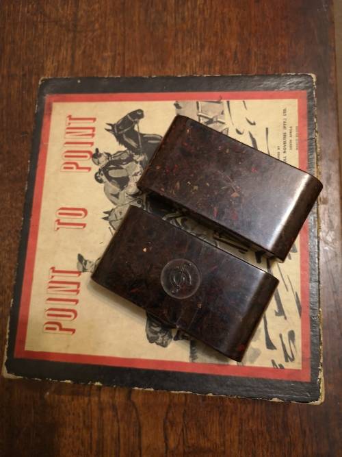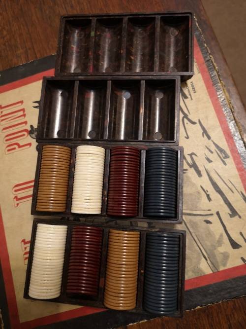WITH 6 HORSES, CAST IN LEAD, HAND PAINTED, MINT CONDITION WITH TWO SETS OF BETTING CHIPS AND SOME PLAYING CARDS. THE BETTING CHIPS ARE HOUSED IN A BACKELITE, HARD PLASTIC, CONTAINER.