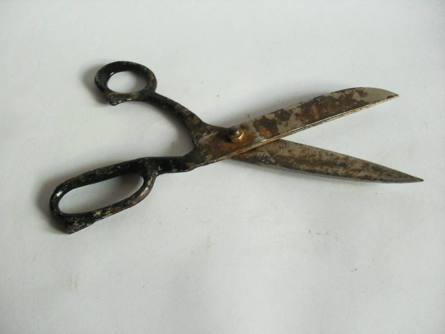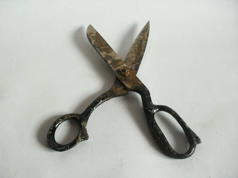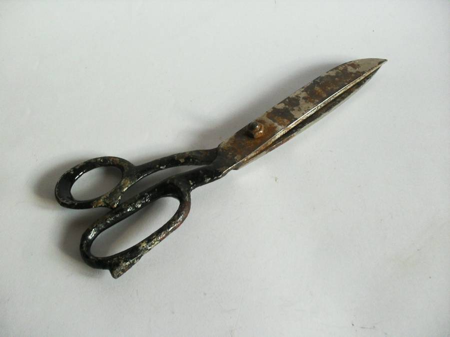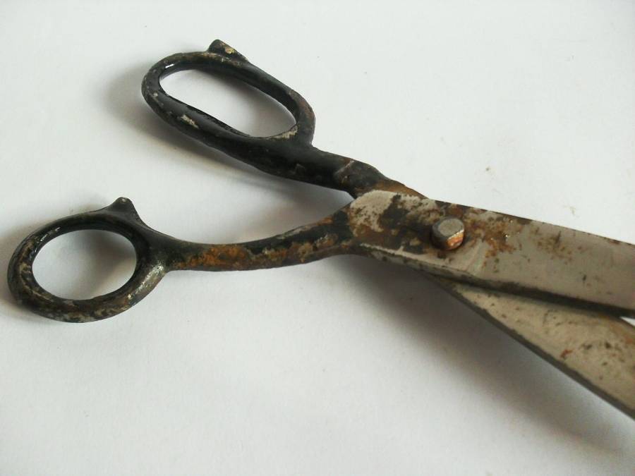 Scissors is homespun and was used by a master tailor for cutting thick woolen fabrics.
