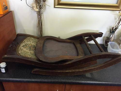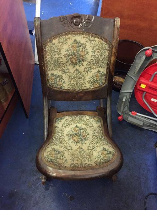Very Old Imbuia Rocking Foldup Chair. Upholstered with Tapestry Fabric. Very Unique Item due toe the fact that it folds up and rocks. Chair Is very old and has some wear on it.