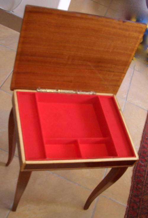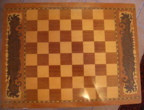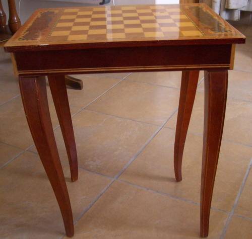 A sweet little Italian inlaid table has a lift lid, revealing a storage space inside and a playing music box, as well as a chess game table top.