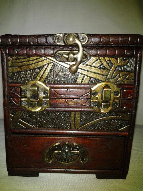 The jewelery box has a clock in with three apartments for jewelery storage.