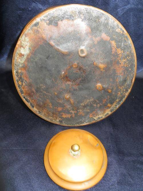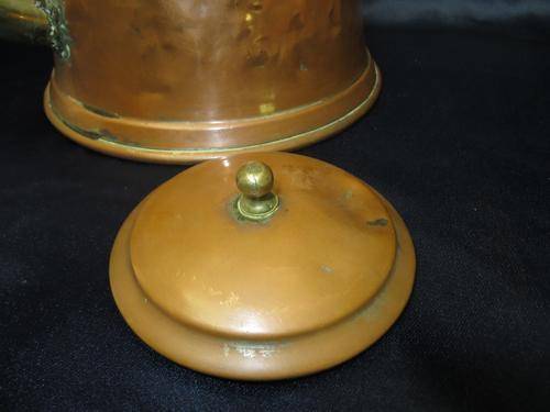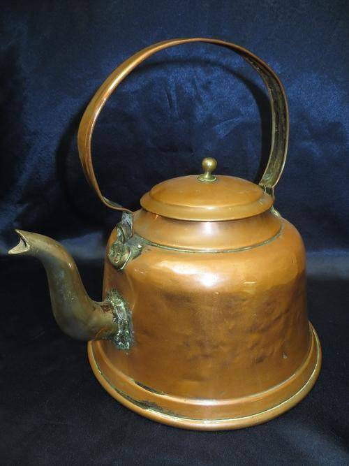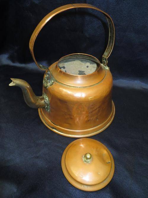 Beautiful solid copper kettle with a brass gooseneck spout. The interior lining is all but gone, so you would want to use the kettle for display only unless you have it re-lined. There is a maker's marks at the bottom.