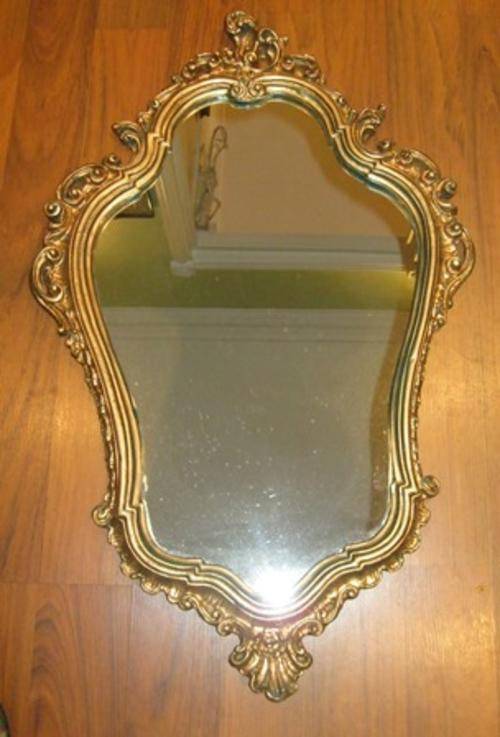 Antique large gold heavy ornate mirror with a chain at the back of the mirror to hang the mirror from, it has beautiful detailing and is looks very impressive when hanging on the wall !!
