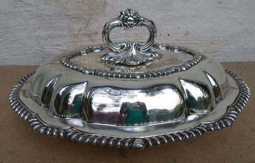 BEAUTIFUL ORNATE ANTIQUE SILVER PLATED OLD SHEFFIELD STYLE VEGETABLE SERVER WITH DETACHABLE LID AND HANDLE (MAKES TWO VEG DISHES WHEN HANDLE IS DETACHED). GUADROONED EDGE. SOME ODD AREAS OF WEAR TO PLATE, BUT GENERALLY VGC, NO DENTS SEEN.