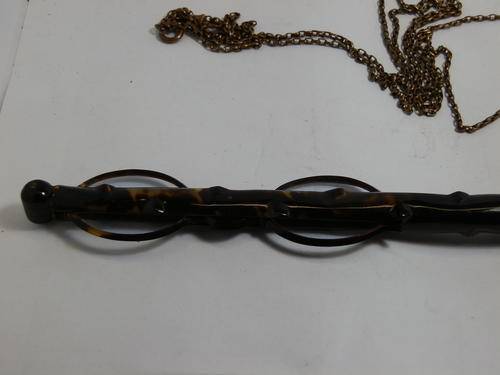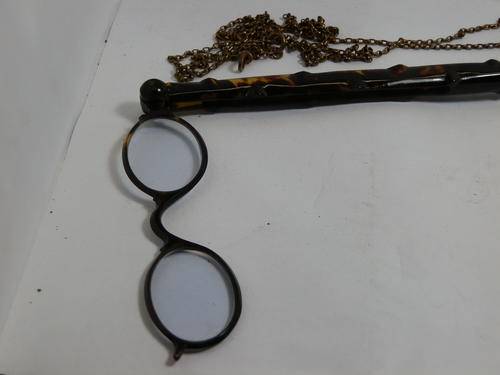 Antique faux tortoiseshell lorgnette on a brass chain, in good condition. Glasses intact and both in place, no cracks or chips. The size is 11.5 x 27 cm and the length of the chain is 82 cm.