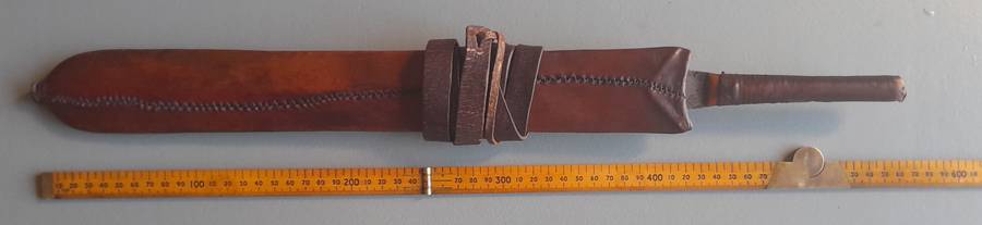 This particular example showcases a 42cm, sharply pointed, stiff leaf-shaped blade, broad and weighted toward the tip, an effective design for cutting. The handle is wood, wrapped in cord and covered in leather for a secure grip.