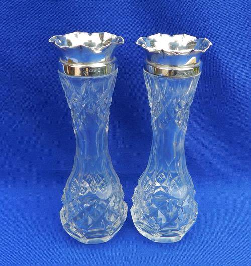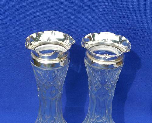 John & William Deakin Matching Pair Of Silver Rimmed Cut Glass Vases. The Silver Fluted Rims are Hallmarked with JD over WD in a Sheild, the Chester Mark and Date Mark for 1902.