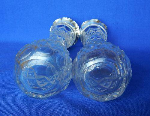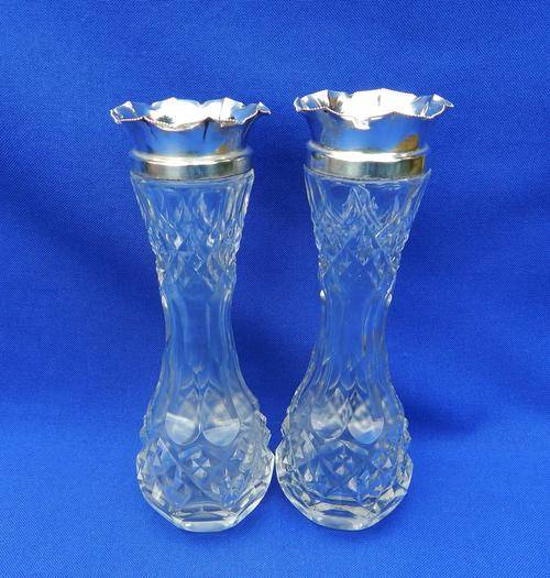 These Vases are in excellent antique condition. Consistent with age, there are a few minute nicks on the cut glass which are very difficult to see and are mentioned only for accuracy. The Solid Silver Rims show some slight signs of wear.