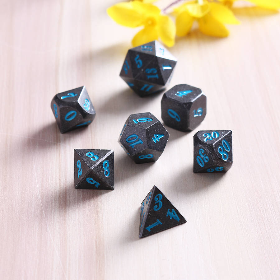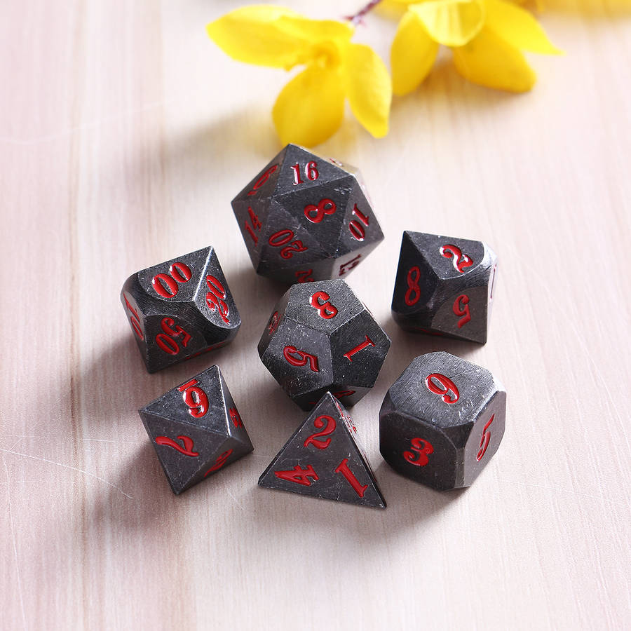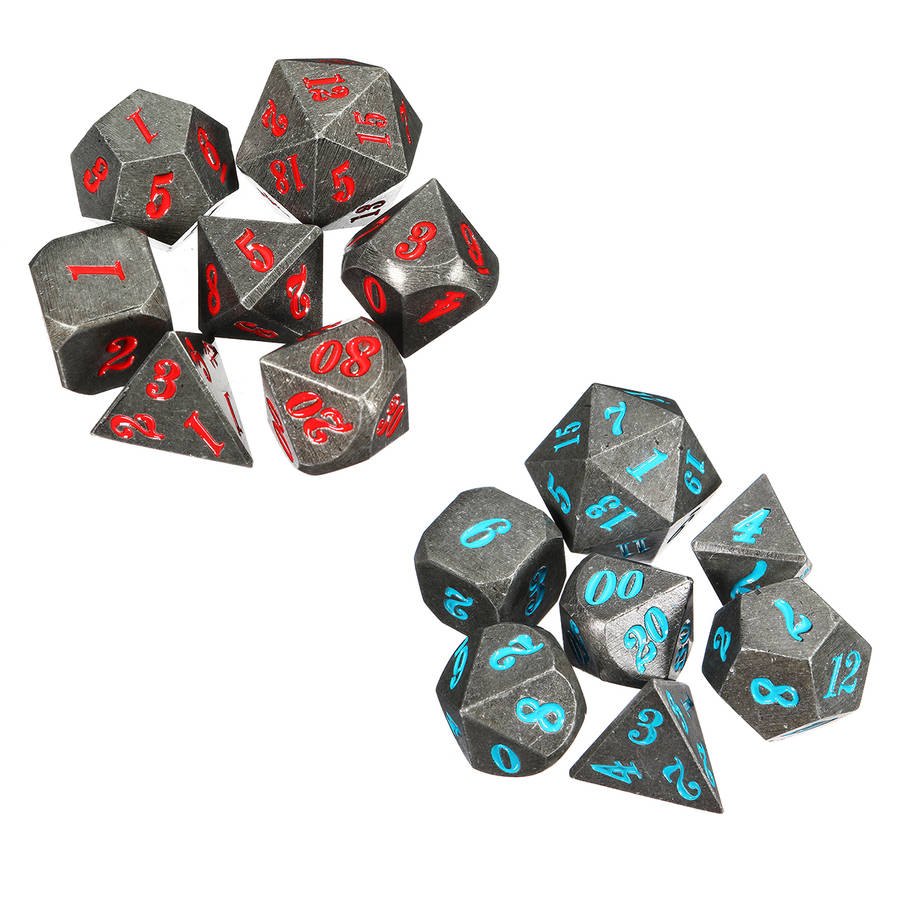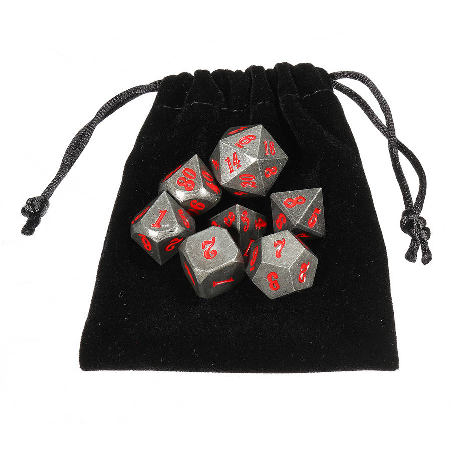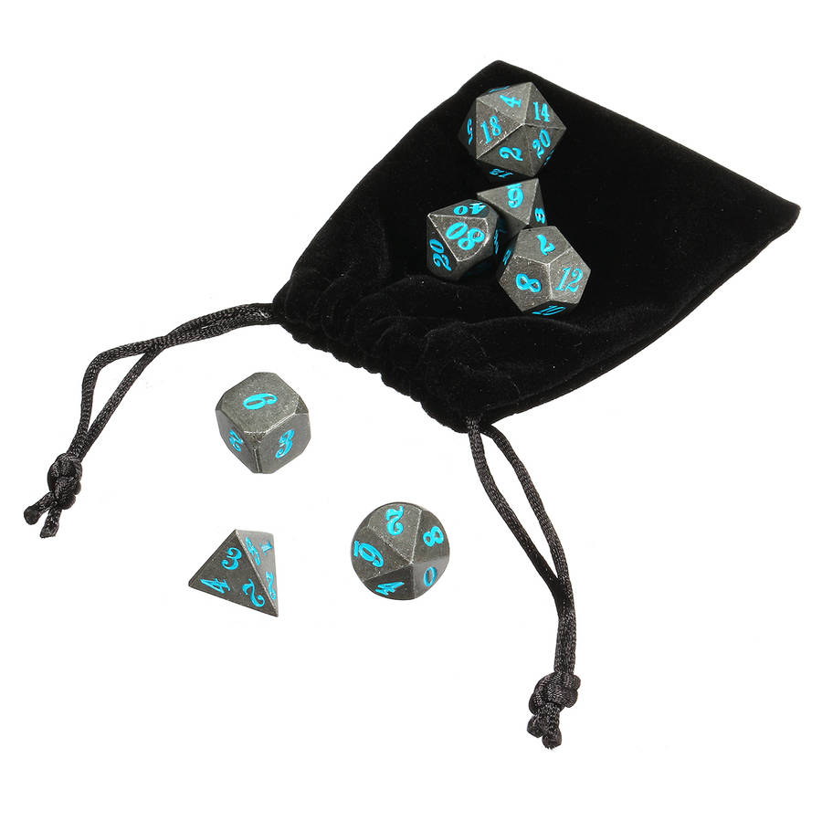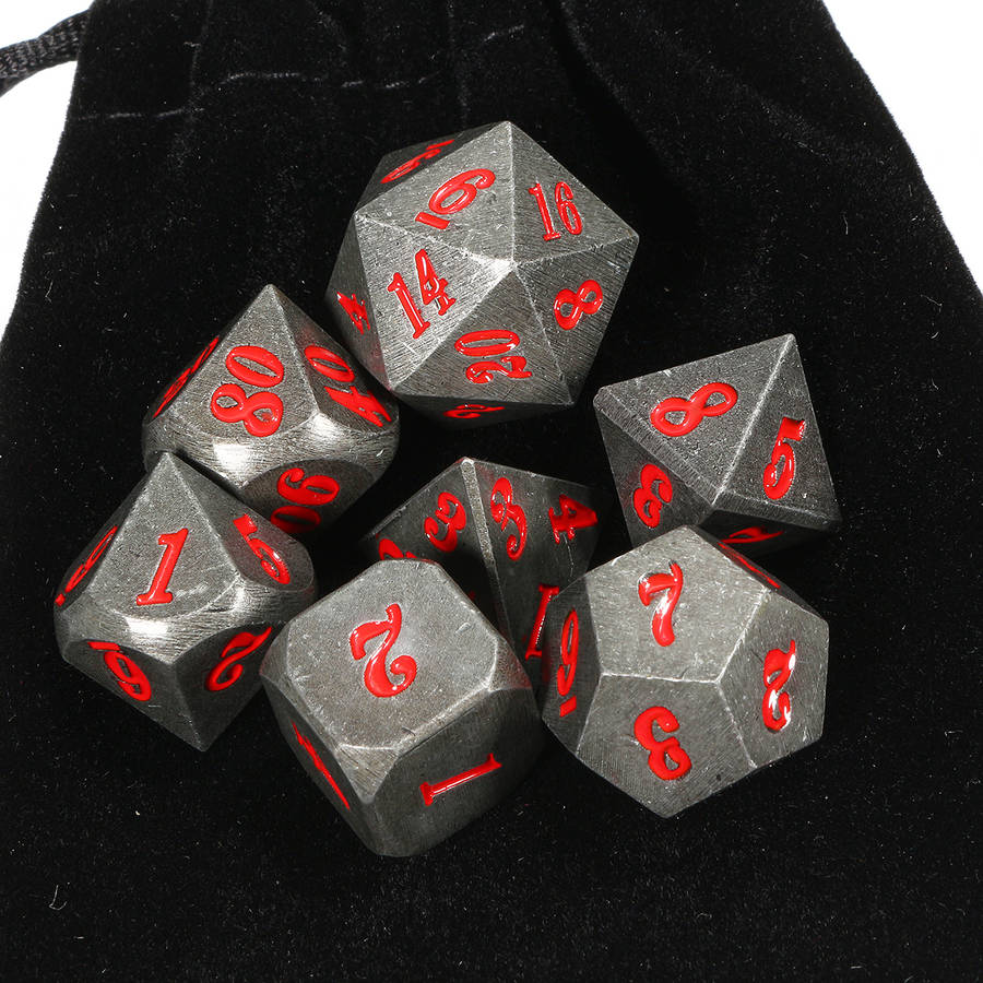 Heavy Metal Polyhedral Dice DnD RPG SET 7pcs w/ BagSpecifications: Material: Metal Quantity: 7pcs Weight:130g(approx.) Features: - A perfect gift for TRPG game lovers. - Customize your games with very personal set of dice. - Each color comes with 7 different dice: 4, 6, 8, 10, 12, 20 sided dice and a percentage (%) dice. Package included: 7 X dice 1 X bag More detials: