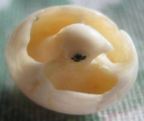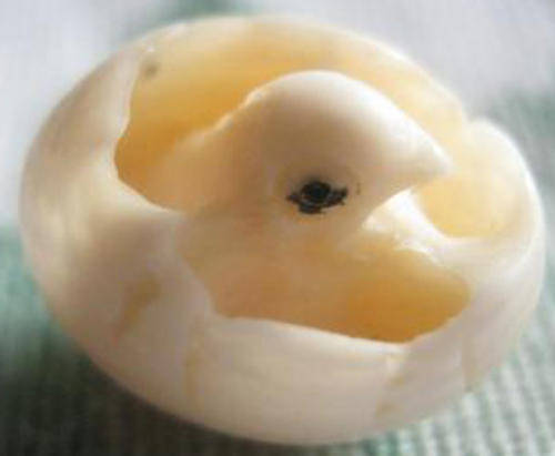 WHAT A UNIQUE FIND, CAN YOU IMAGINE YOURSELF CARVING THIS TINY, TINY EGG WITH A CHIC EMERGING FROM ITS BROKEN SHELL FROM A PIECE OF HARD IVORY, I MEAN HOW DO YOU HOLD IT, WITH WHAT MUST FEEL LIKE HUGE FINGERS ?? THE CRAFTSMAN WOULD HAVE TO BE VERY SKILLED WITHOUT ANY ARTHRITIS IN HIS FINGERS !!!! THE EGG MEASURES LENGTH 1cm, HEIGHT 8mm WIDTH 8mm.