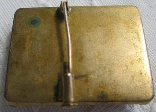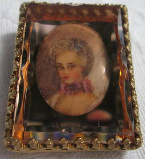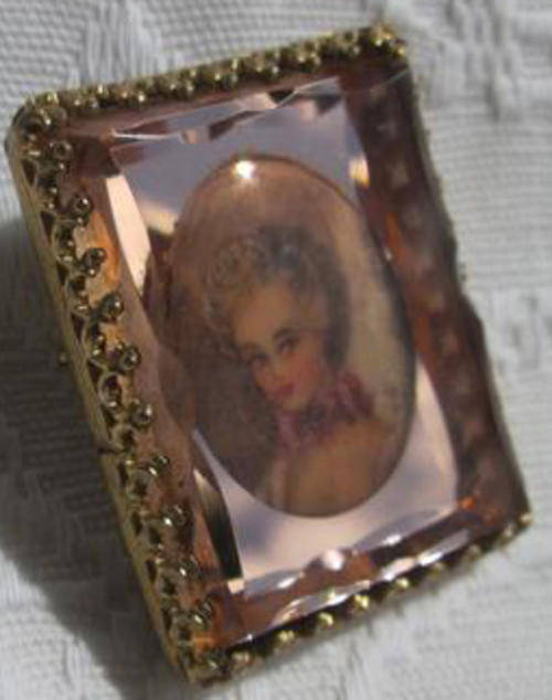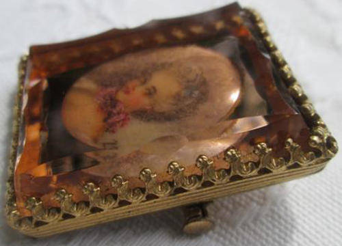 OH !! SO PRETTY, ANTIQUE MINIATURE PORTRAIT BROOCH, BEHIND BEVELLED, PINK TINTED GLASS, ALL CONTAINED WITHIN A FILLIGREE BRASS FRAME. LENGTH 3.5cm, WIDTH 2.7cm, SIZE OF PORTRAIT LENGTH 2cm, WIDTH 1.5cm.