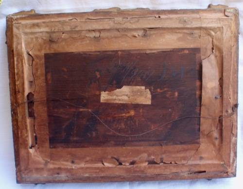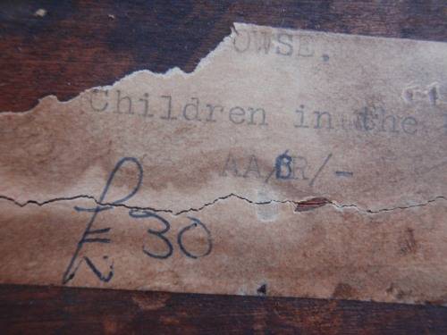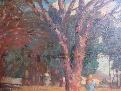ANTIQUE OIL PAINTING 'CHILDREN IN THE PARK' - SIGNED WITH INITIAL 'R'. HAS A PARTIAL LABEL ON BACK (SEE PHOTO BELOW) TYPICAL OF VERY OLD PAINTINGS, IT IS PAINTED ONTO A PIECE OF WOOD. THE WOOD HAS SPLIT IN THE MIDDLE BUT HAS SOME RESTORATION WORK IN THIS AREA. IN ORIGINAL ANTIQUE FRAME THAT HAS LOTS OF DAMAGE TO THE MOULDINGS. AREAS WHERE MOULDING HAS CHIPPED OFF HAS BEEN TOUCHED UP WITH GOLD PAINT. SIZE: 34CM X 23CM (PAINTING ONLY) FRAME MEASURES WIDTH 8CM.