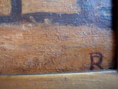 SEE AREA WHERE THE WOOD HAS SPLIT IN THE MIDDLE AREA OF THE PAINTING - HAS BEEN RESTORED.