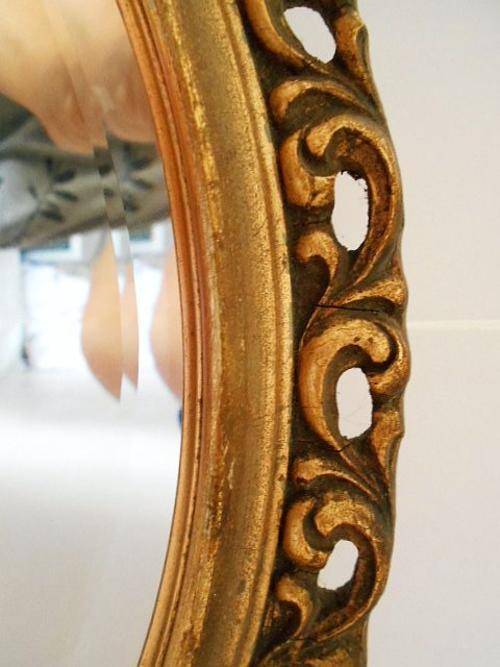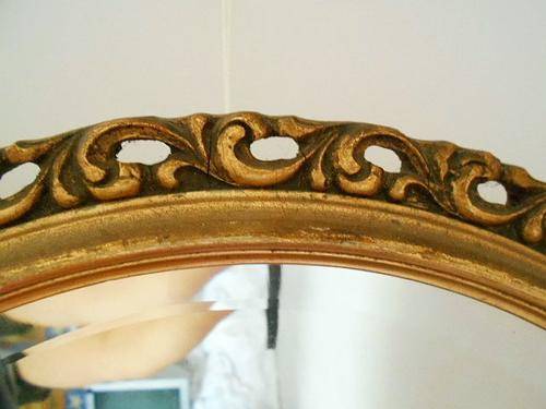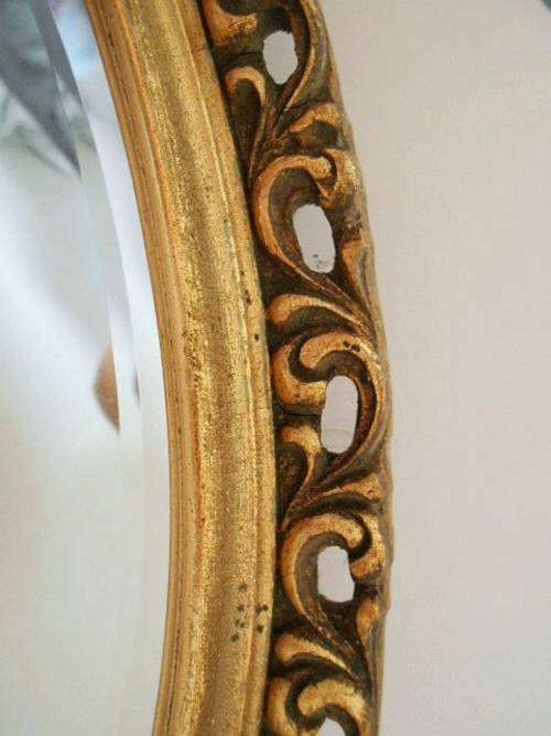 ANTIQUE OVAL WOOD CARVED ORNATE GILT BEVELED MIRROR, PROBABLY MADE IN ITALY