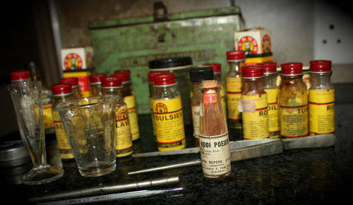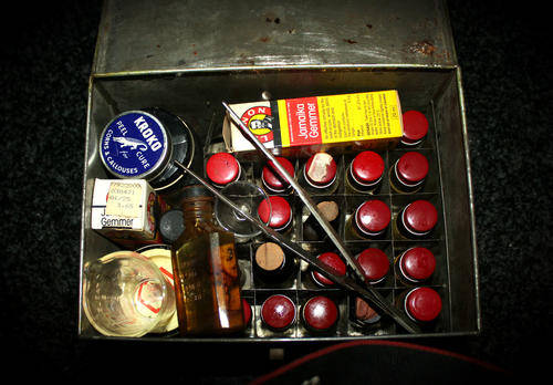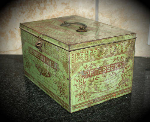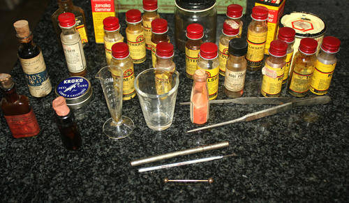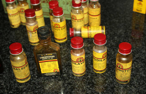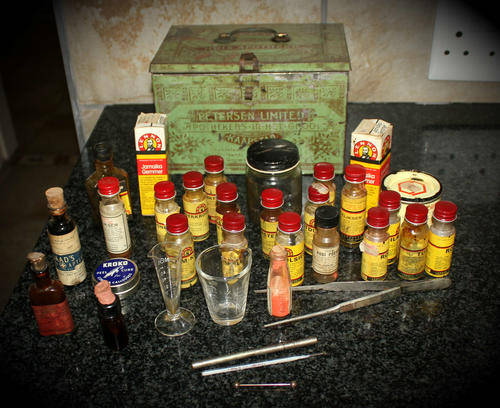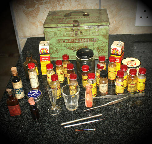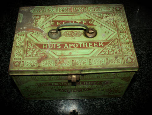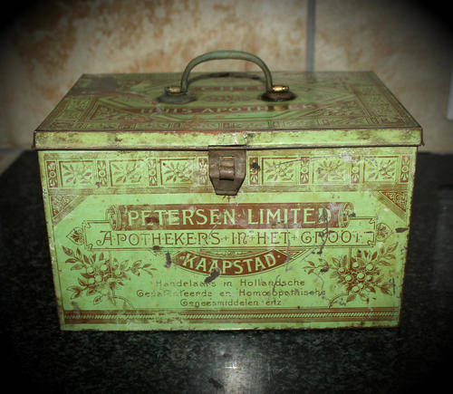 -Antique Petersen Echte Huis Apotheek Tin with medicine bottols and tools .132x220x155mm : Dutch inscription on tin: Petersen Limited Apothekers In Het Groot Kaapstad Is beroomd door het geheel Kaap Kolonie Oranje Vrij Staat en Transvaal voor hunue nitmuntende qualiteit incudes tools and old medicine bottles some still with some contents. like Rooi Poeier,wonderkroon druppels,Jamaika Gemmer,Potasium,Kroko Peel cure for corns & callouses,Plastolin,Rooi laventel,Stirlington,Lewensessens, Balsem CONDITION: All Items SOLD as FOUND - -Please see ALL IMAGES below |