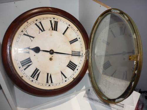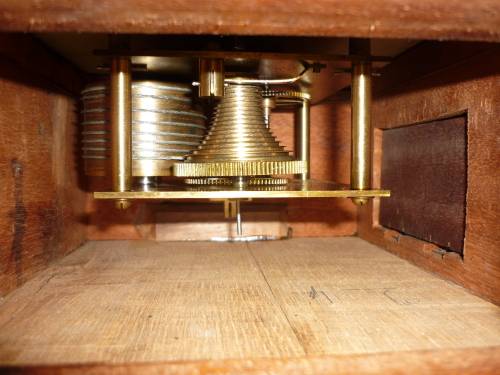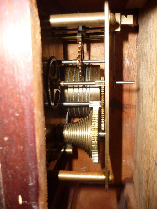 I have been told by a clock expert that there is a single Fusee movement. It was originally a school clock at the turn of the Century. It comes with the pendulum and key. It is in working condition.