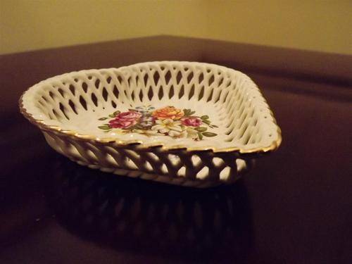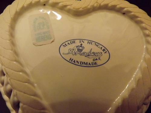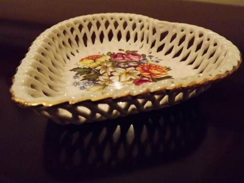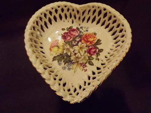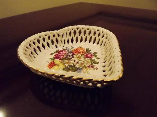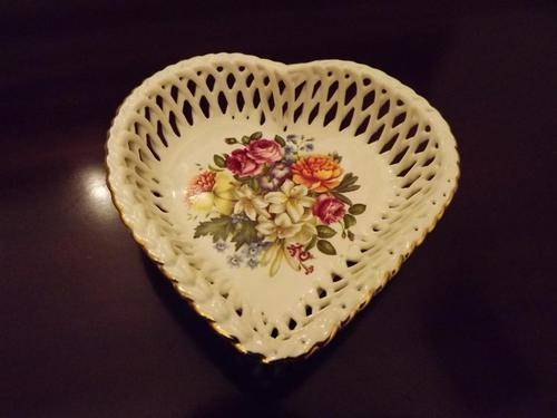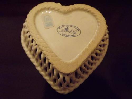 ON OFFER A BEAUTIFUL FINE CHINA HEART SHAPED TRAY / HOLDER WITH A PRETTY HAND MADE FLOWER BOTTOM AND WHITE 'PUNCHED OUT' RIM WHITE WITH 24 CARAT GOLD TRIM . THIS BEAUTIFUL DISH IS HANDMADE IN HUNGARY. THIS IS A PRETTY VINTAGE TRAY THAT WOULD LOOK LOVELY IN YOUR LIVING/DINING ROOM OR A BEDROOM. DAINTY AND PRETTY DESIGN.