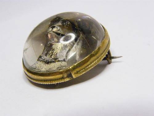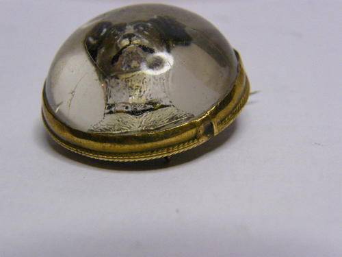 Reverse Intaglio Essex Crystal Brooch with dog, Late 1800's or early 1900's - Looks like it is set on silver foil & in a gold colour brooch - as per photo