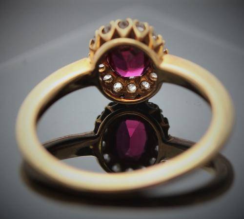 This beautiful piece from a bygone era is in amazingly good condition. The 0,24 carat solitaire ruby is claw set in 18k yellow gold and framed by 14 x 1,5 mm rose cut white diamonds - a faceting style rarely used these days but popular from the 1500's. The colour combination in this ring is particularly striking - the white of the diamonds, the deep red of the ruby and the strong yellow of the 18ct gold. Its a beautifully proportioned piece and surprisingly solid to handle. It weighs 4,2 grams and the shank itself is distinctly heavy.