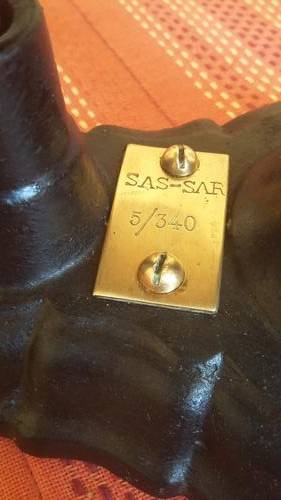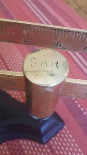 This cast iron and brass unequal arm balance scale with bronze pan and built-in counterweights is stamped SAR - SAS and numbered 5/340. The larger counterweight is stamped SAR.