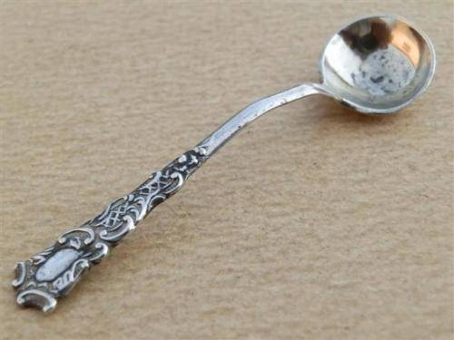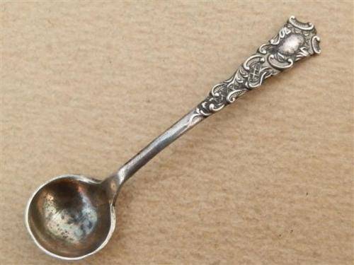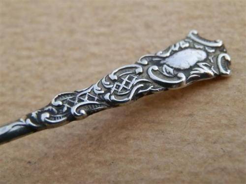 Lovely antique silver salt spoon with lovely decoration and a blank cartouche, hallmarked Birmingham, circa 1910 and a antique silver pickle fork, not marked but tests + for silver, both in good condition. The size of the spoon is approx 0.14 x 15.5 cm, the size of the fork 1.1 x 11.5 cm, the weight of the spoon is 2.29 g and that of the fork 5.01 g. Very nice!!