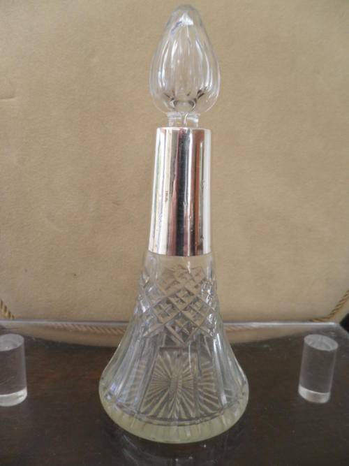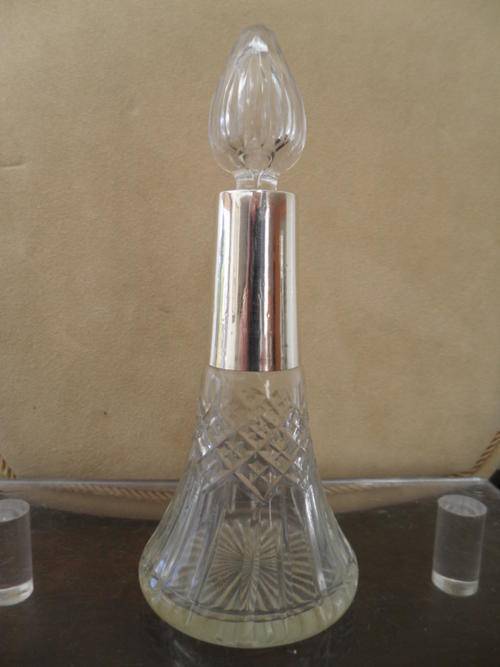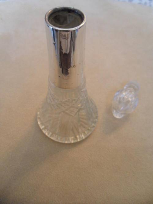 ANTIQUE STERLING (HALLMARKED) SILVER CUT CRYSTAL PERFUME BOTTLE. A TINY FLEA BITE TO THE VERY TOP OF THE STOPPER HAS BEEN POLISHED AWAY - FOR THE REST THE CONDITION IS PERFECT. 13cm.