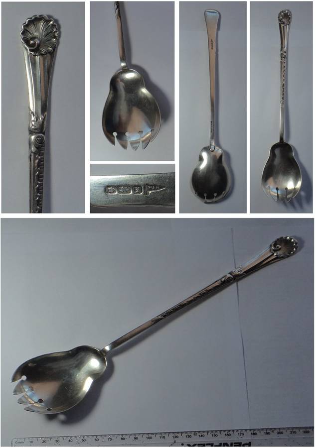 Pear shaped bowl with 5 tines. Unusual rococo decorated handle with shell and scrolls. Hallmarks clear, also has registration number 212485 to protect the design. Good condition. Length 27 cm, weight 92 grams.