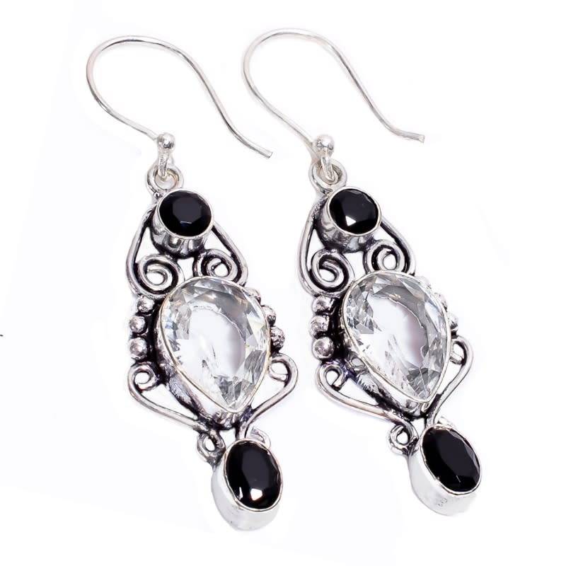ANTIQUE STYLE WHITE TOPAZ AND BLACK ONYX GEMSTONE .925 STERLING SILVER EARRINGS