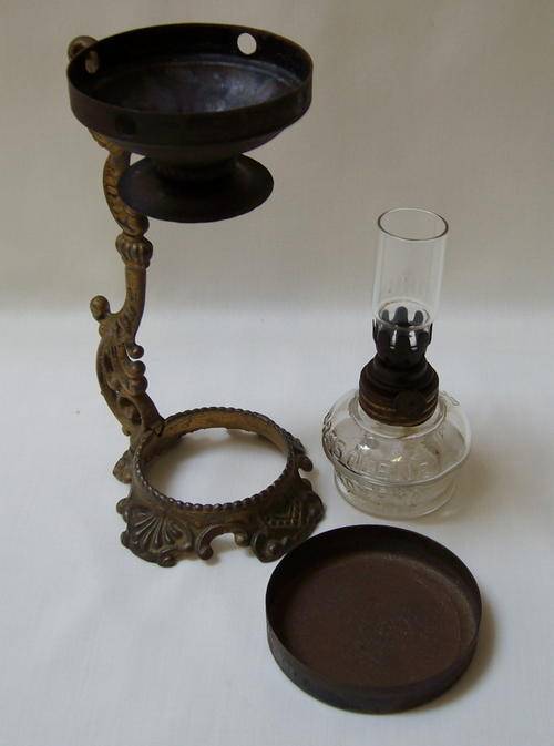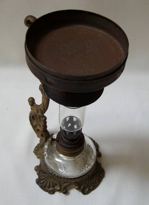 A bronzed cast iron, pressed glass and brassed tinplate asthma and whooping cough vapour lamp.
