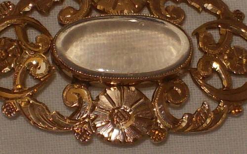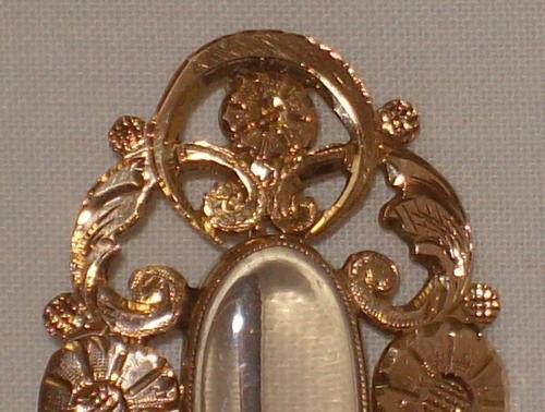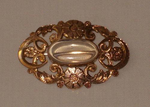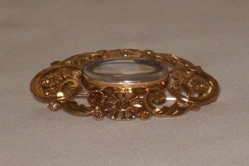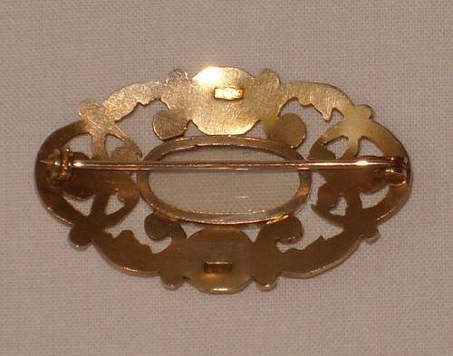 A bright-cut engraved nine carat gold oval brooch, set with an oval optical quartz cabochon, in original