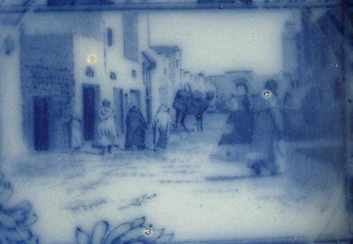 As you will see, it appears to portray an Middle East scene, there is a camel in the background and a number of 'Arabic' dressed individuals. On the left of the scene, there appears to be writing on the wall. There is a famous 'Ottoman Series' of designs which came from an unrecorded pottery, but, they usually named the design. Possibly, the above design was inspired by one of the Ottoman designs.