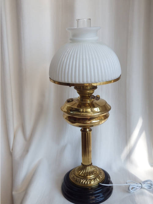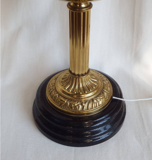 The lamp is in very good condition for its age. It has been converted to electricity and has been recently rewired. The ceramic base shows no chips or cracks and the lamp stands firmly without wobbling at all.