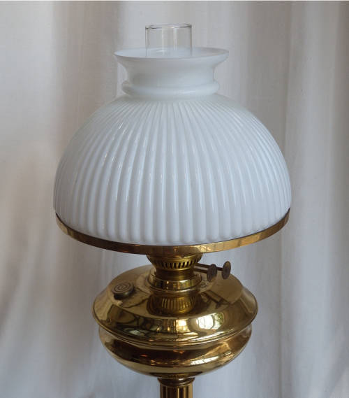 This auction is for a superb and impressive antique Victorian Oil Lamp, dating around the 1870 - 1890 era.It boasts a white ribbed glass shade, which is supported by a reed fluted brass column over an ornately embossed brass base section which sits over a waisted socle base fashioned from black glazed china. It stands approximately 68 cm high to the top of the glass chimney, with the lampshade being 25cm in diameter.
