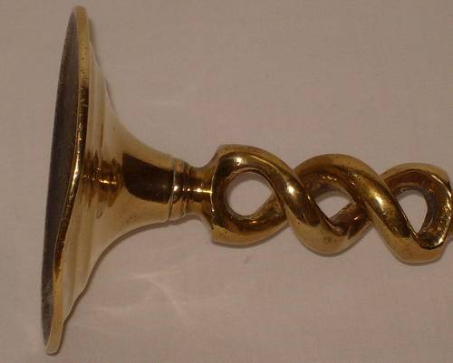 A late 19thC brass candle holder with an open twist stem, on a round foot.